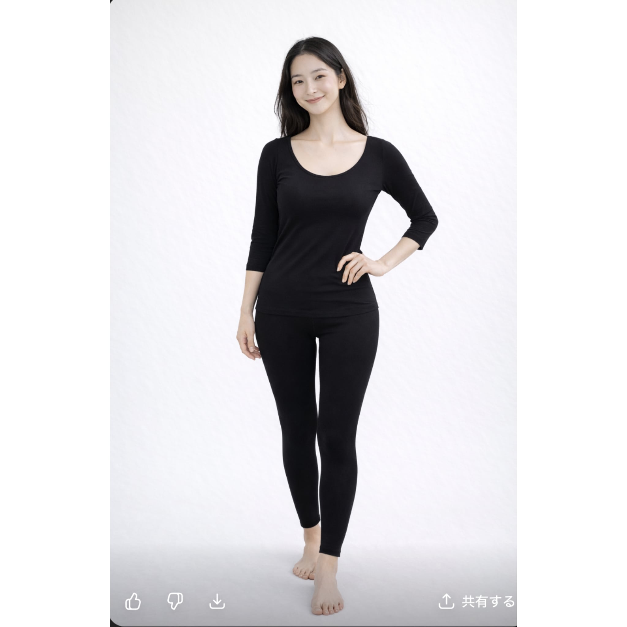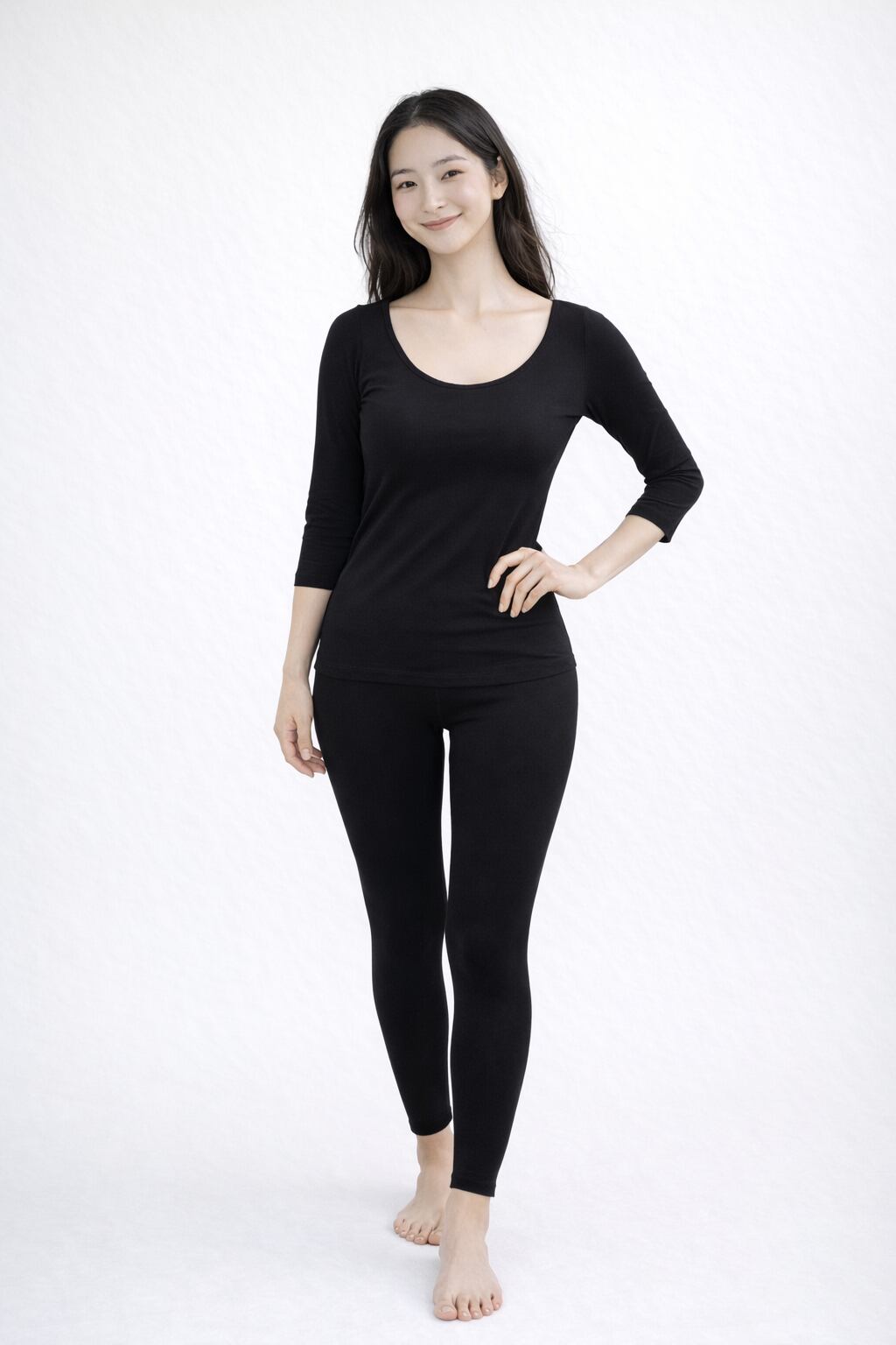 深めの襟ぐりでアウターに響きにくく、7分袖がすっきりとした印象を与えます。薄手なのでアウターのシルエットを邪魔せず、ファッションの幅が広がります。