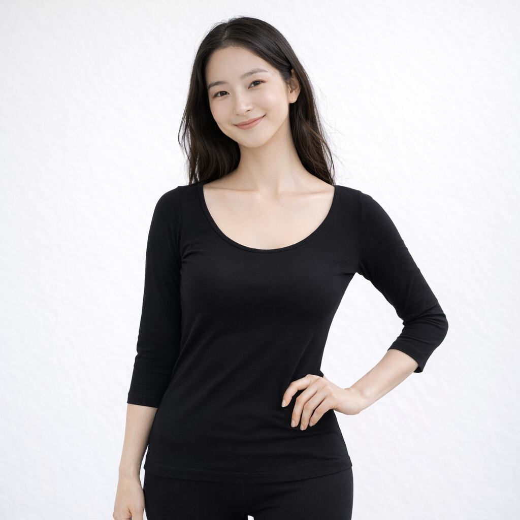 深めの襟ぐりでアウターに響きにくく、7分袖がすっきりとした印象を与えます。薄手なのでアウターのシルエットを邪魔せず、ファッションの幅が広がります。